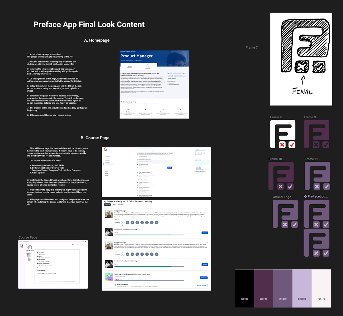 For the logo, we explored quick sketches and multiple digital variations before choosing a final mark that communicates what Preface stands for: preparation + proof + progress. The icon combines a bold initial with check / X elements to hint at learning, assessment, and completion, matching the core flow of taking a course, demonstrating proficiency, and earning a certificate. We refined the logo to work in different contexts (app icon, header, certificate, profile) and kept it minimal so it stays recognizable at small sizes while still fitting the overall “modern and clean” design language of the UI.
