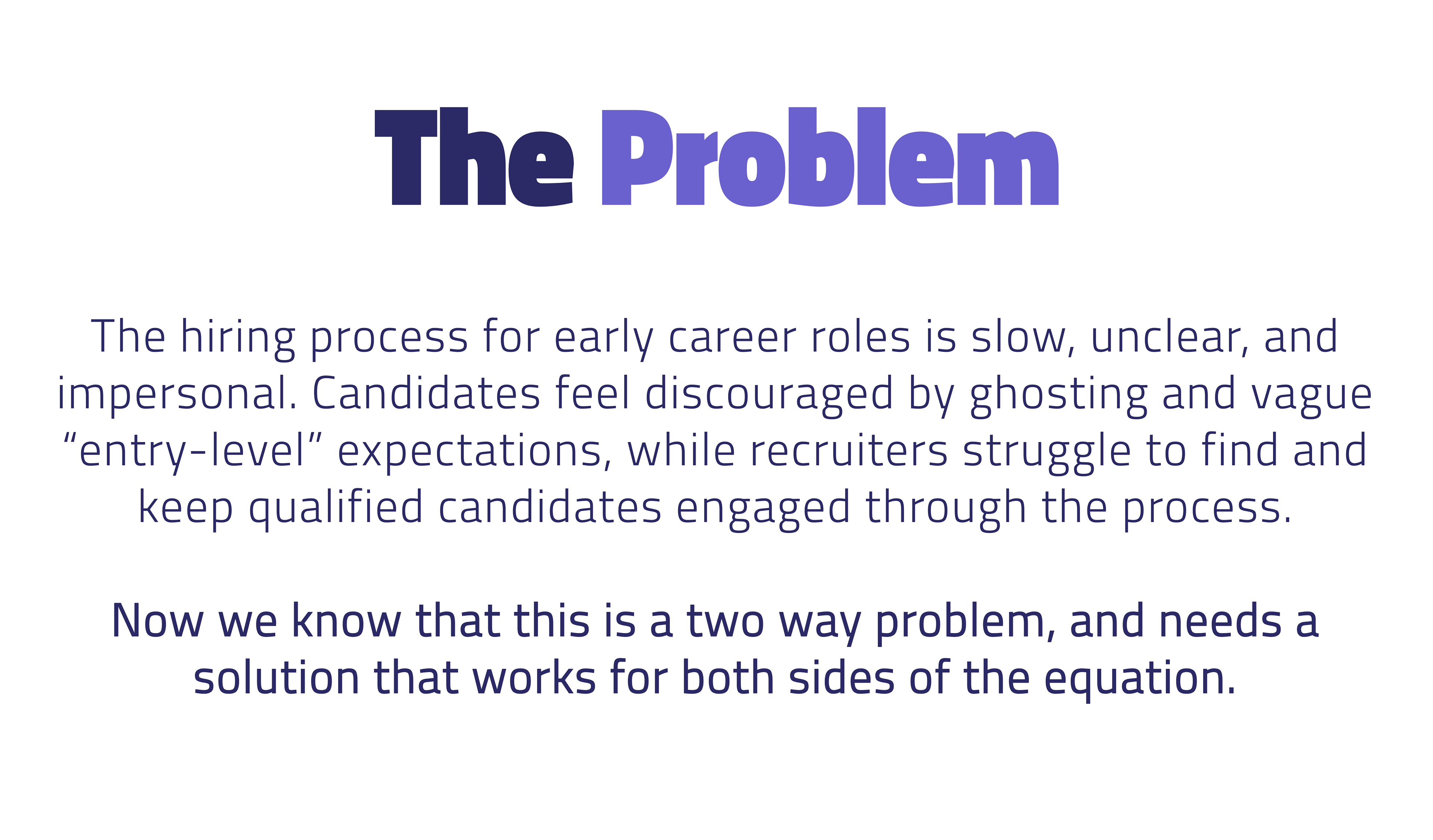 Recently graduated candidates need a clearer, more human, and more transparent path to prove readiness for finance roles because current hiring is often impersonal, vague, and slow, leading to candidate anxiety and disengagement, while recruiters still struggle to identify the best fit applicants efficiently.