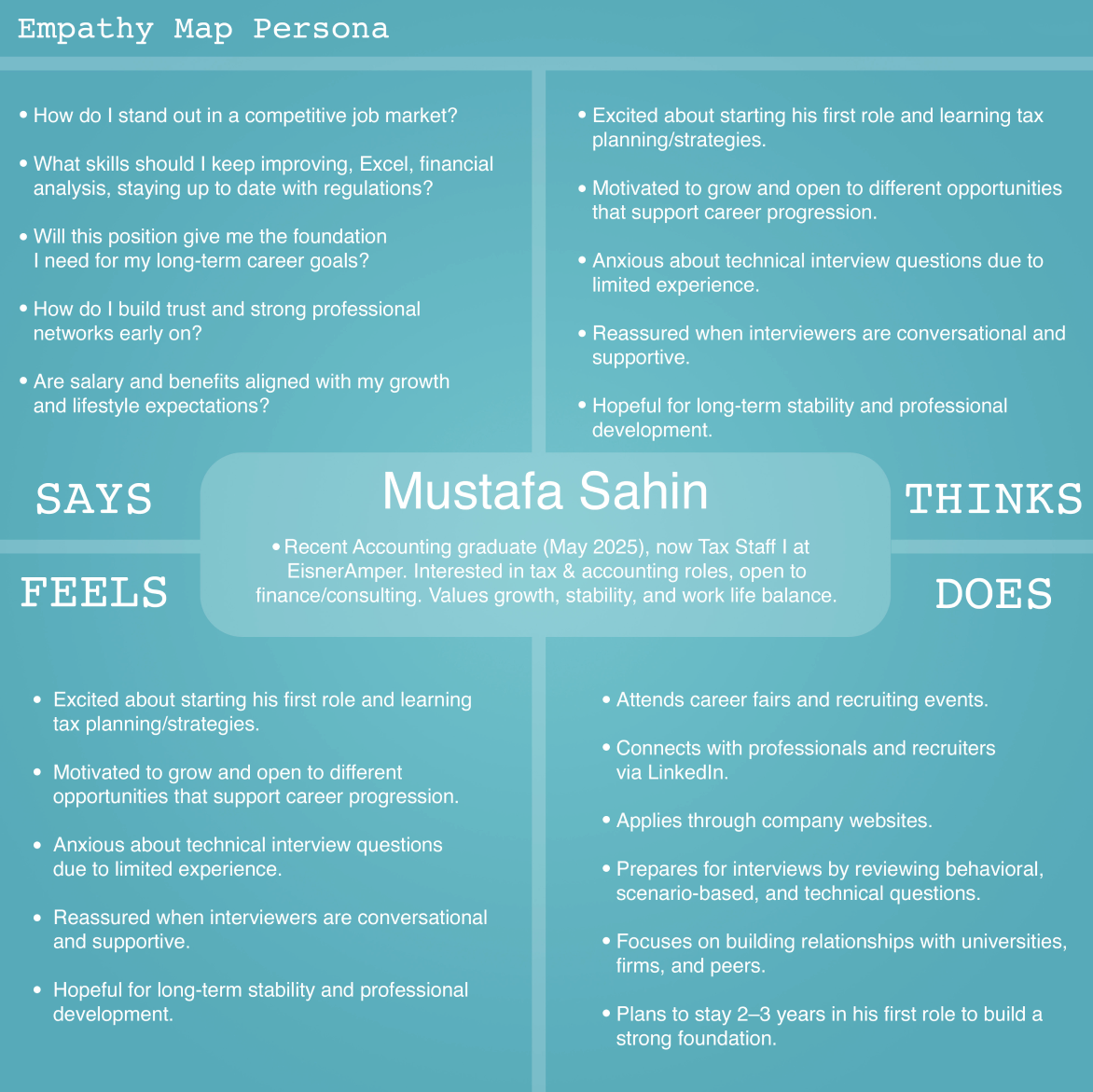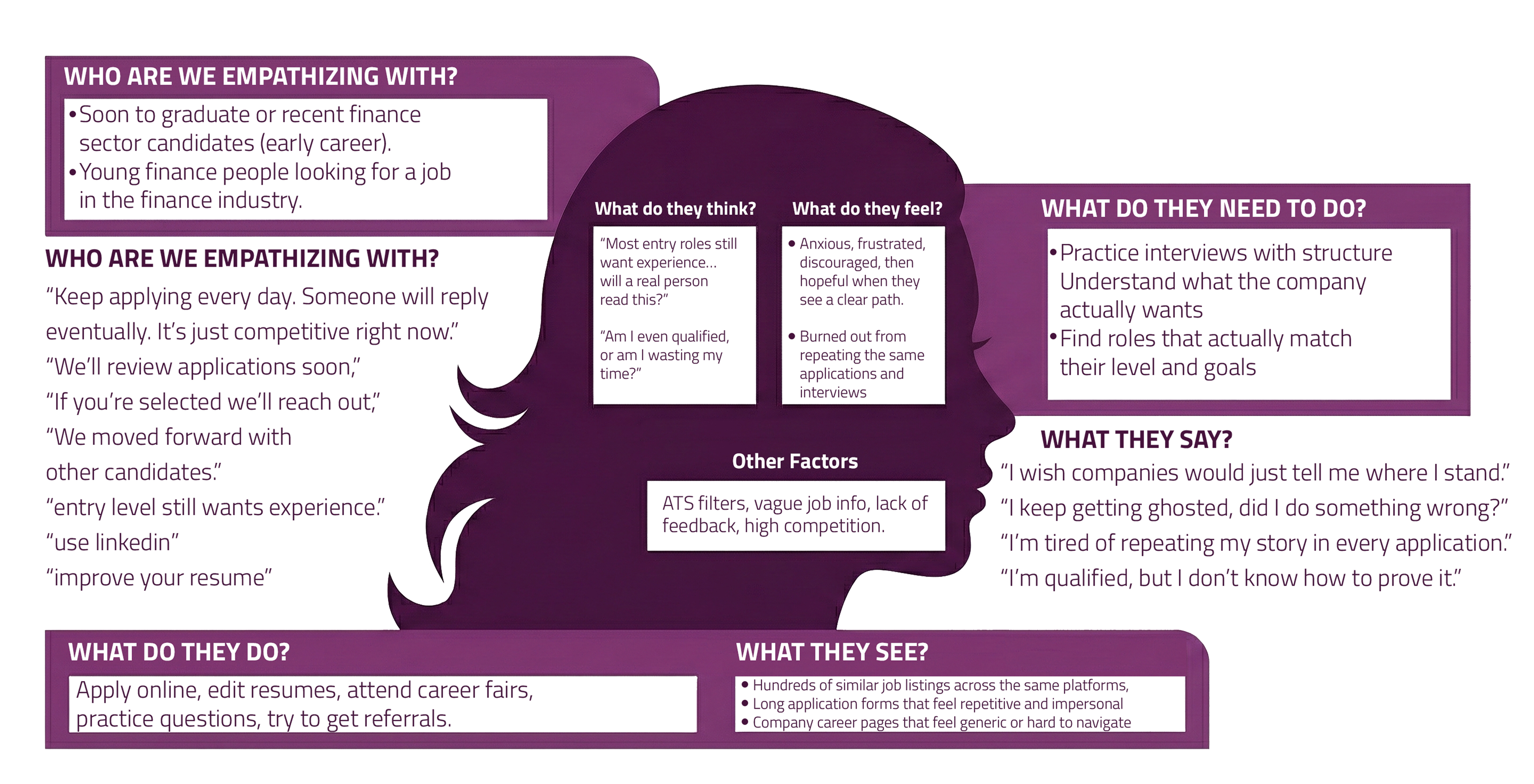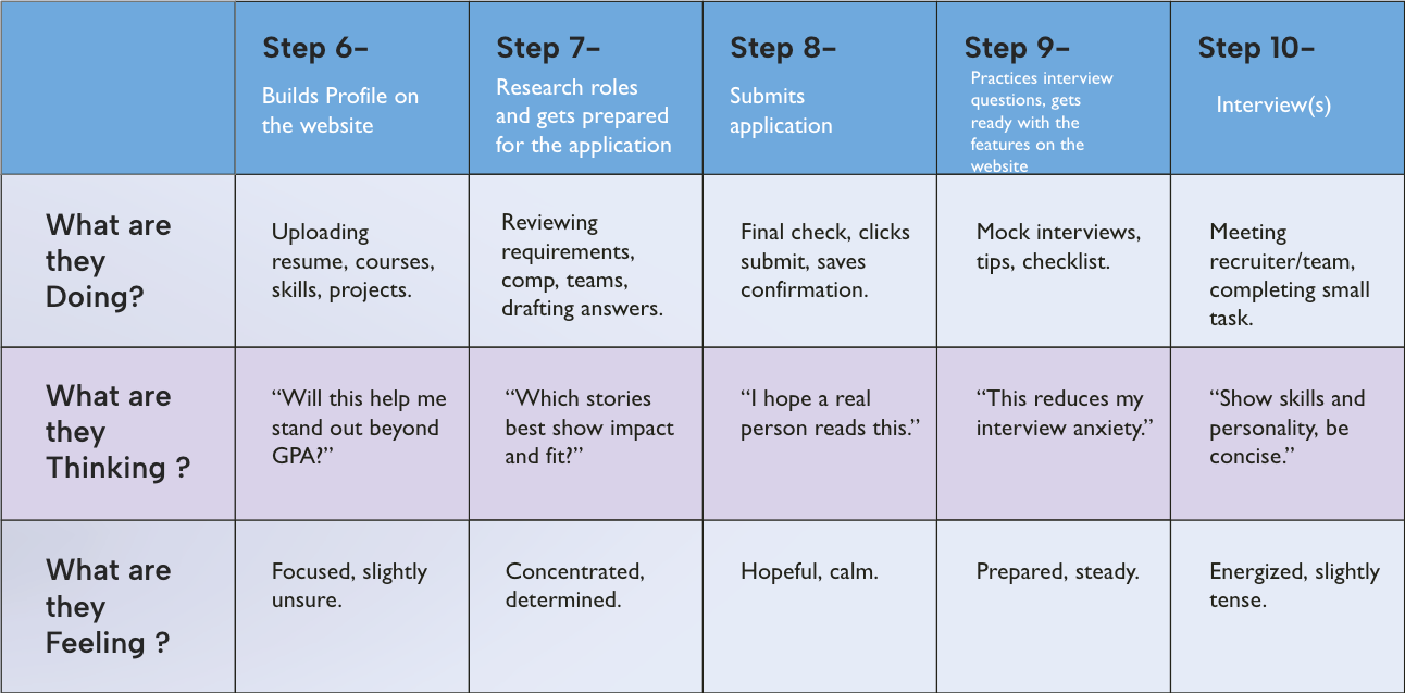 An empathy map helped us summarize what candidates experience during hiring, what they see, hear, think, feel, say, and do. We used it to keep our design focused on real pain points and guide Preface’s features toward clearer preparation, proof, and communication.