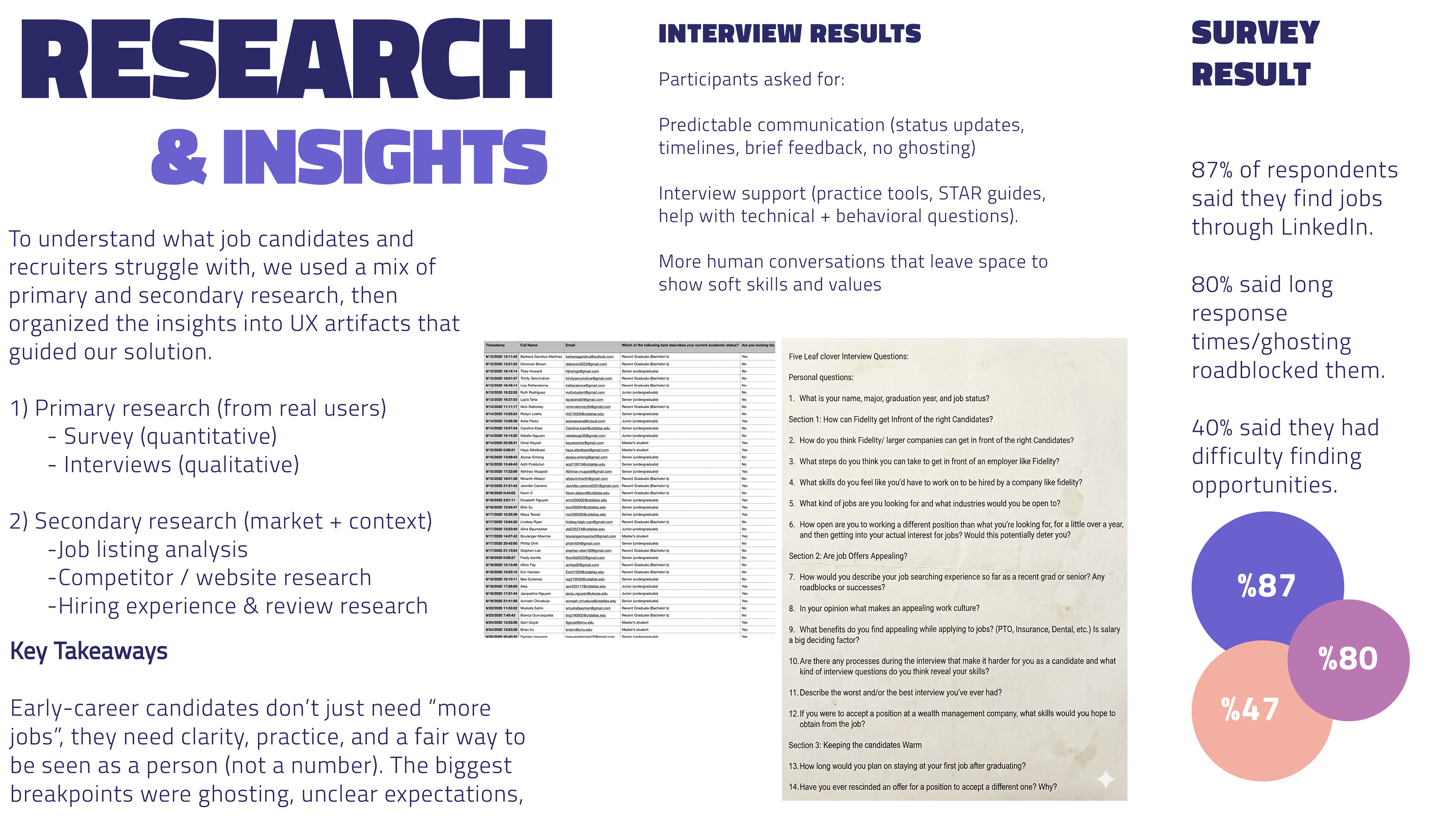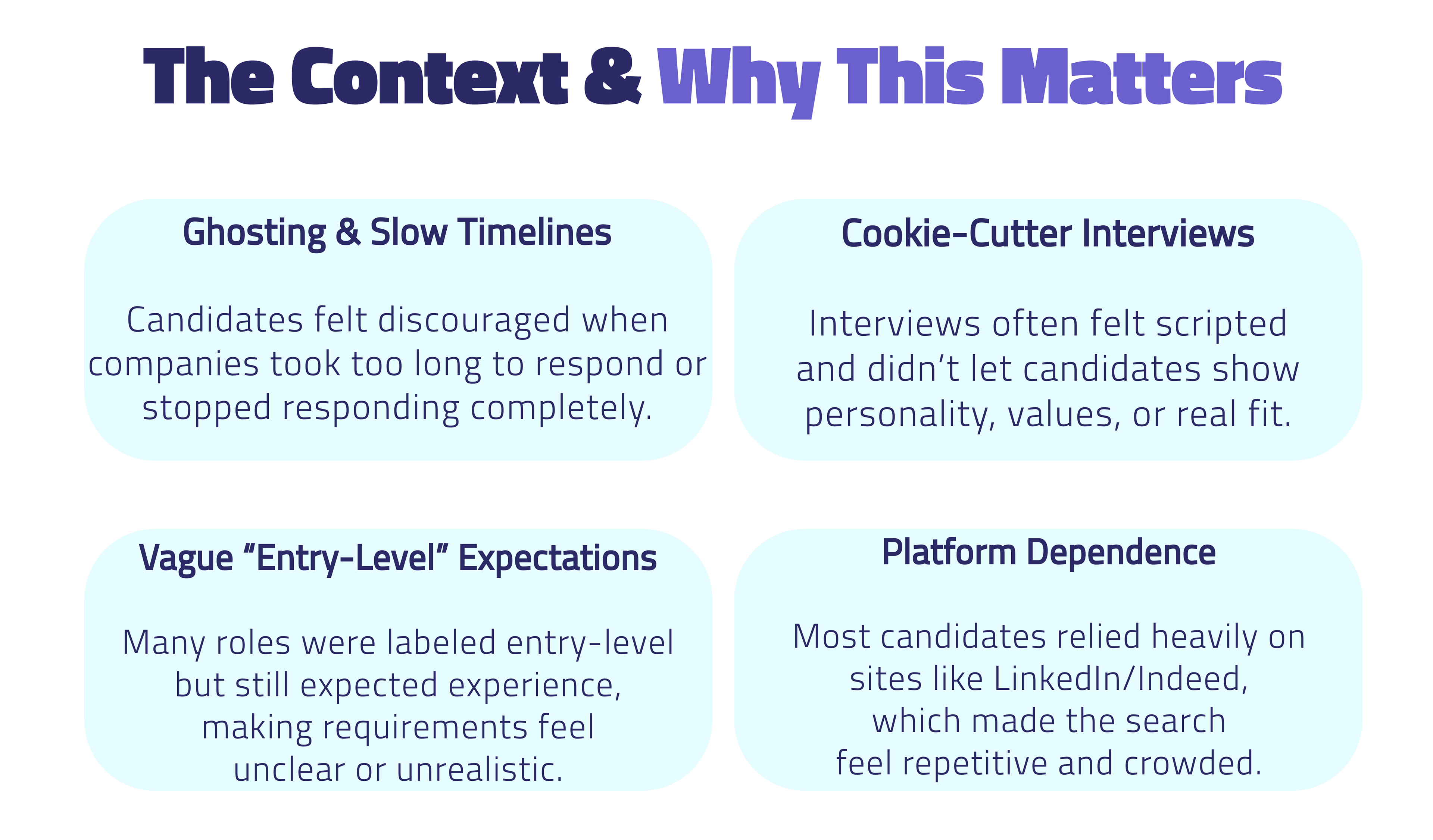 Unclear expectations, lack of human connection, and unpredictable communication. That led us to prioritize tools for interview prep, clearer role information, and a more transparent process that helps candidates show both technical ability and soft skills.