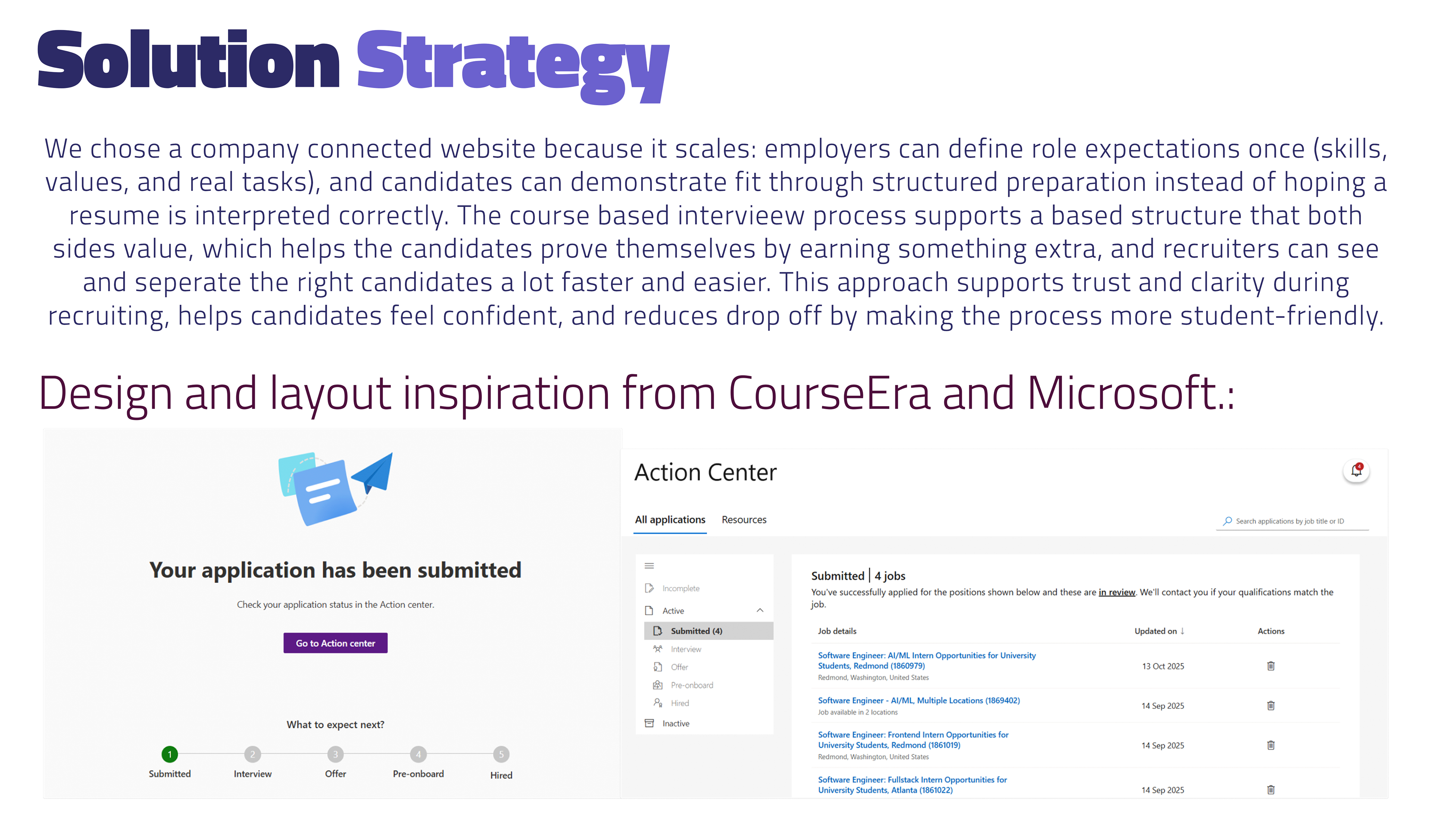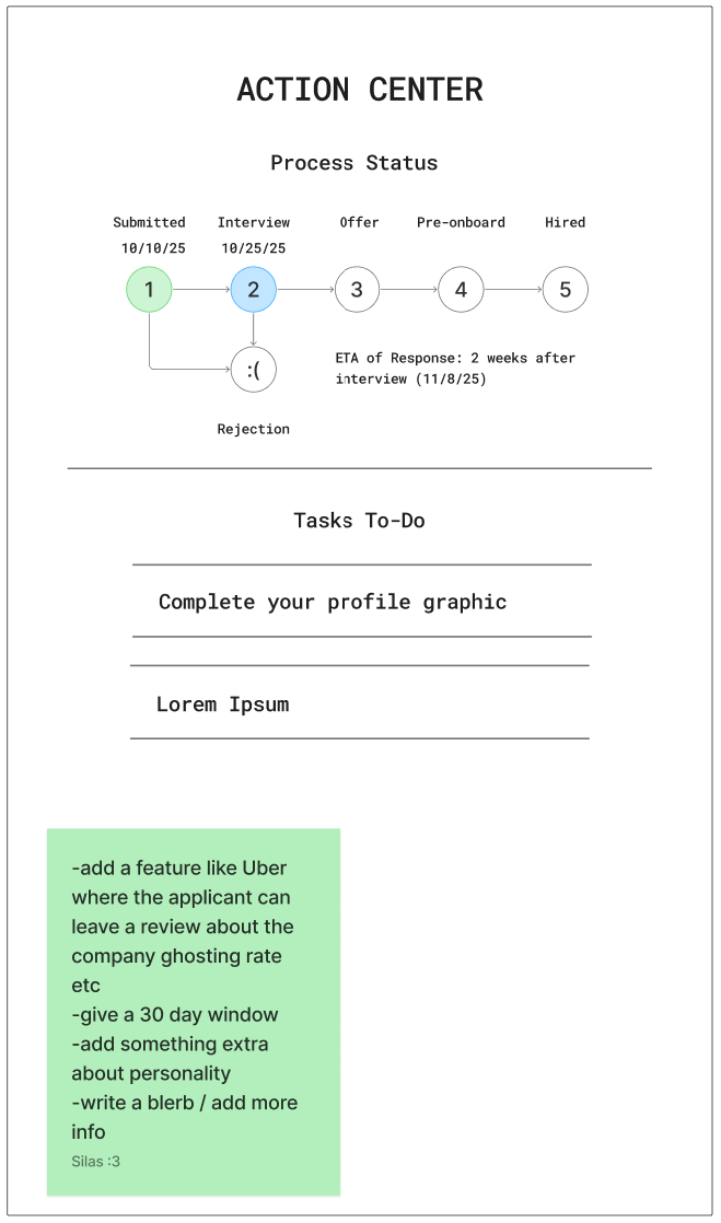 We explored an “Action Center” dashboard to track application status and add extra feedback features, but we removed it in later iterations. After reviewing the HR workflow, we realized it added complexity and would require extra effort from recruiters, going against our main goal of saving this company's time, so we focused on simpler, high-impact features that keep the process fast and easy to manage.