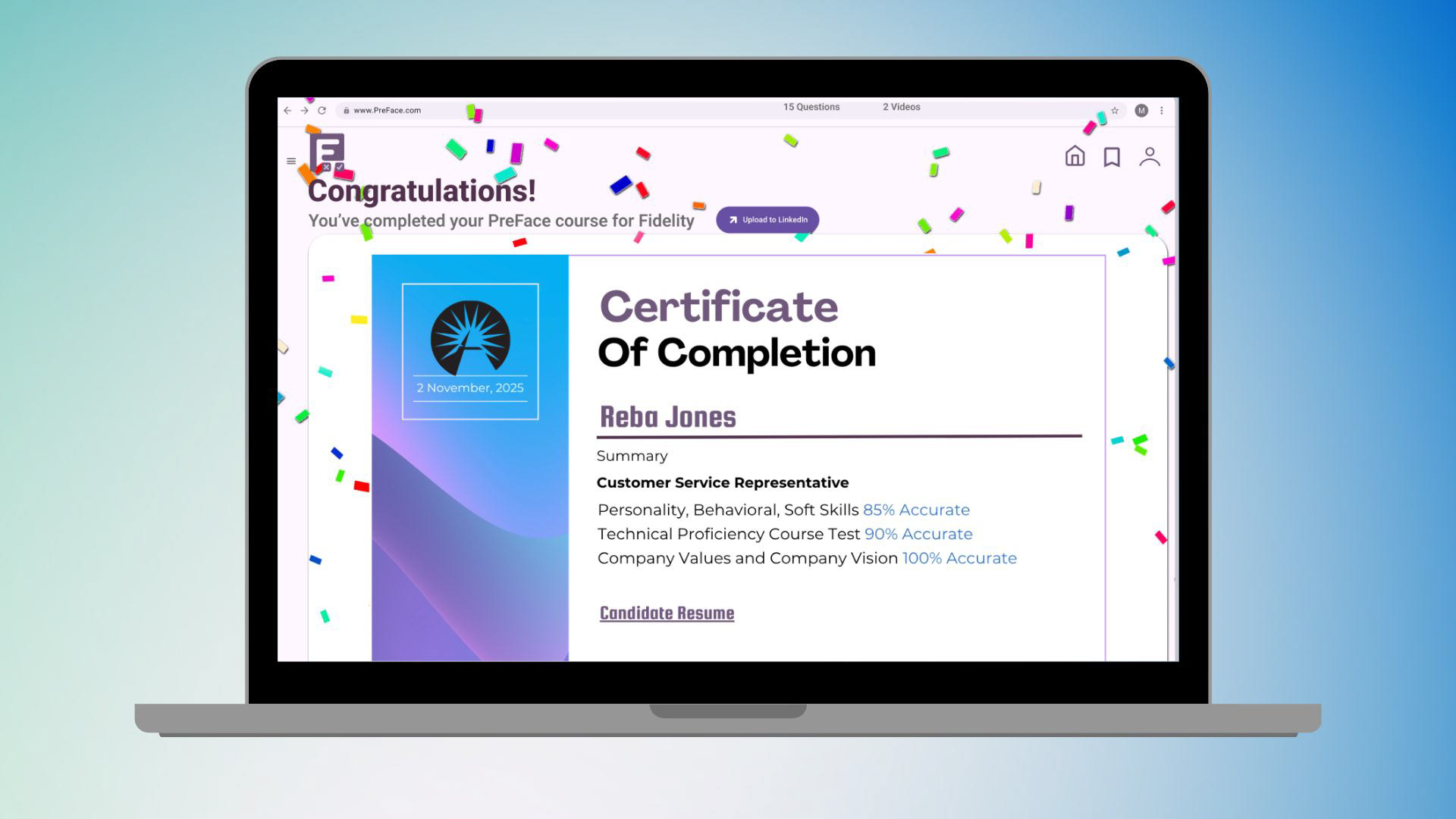 The final certificate screen is designed as a reward moment, clear proof of completion, key proficiency metrics, and a simple way to present results.